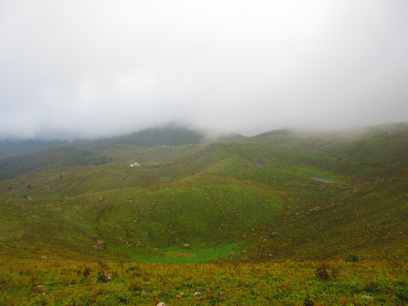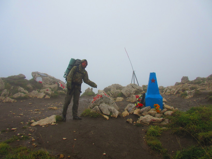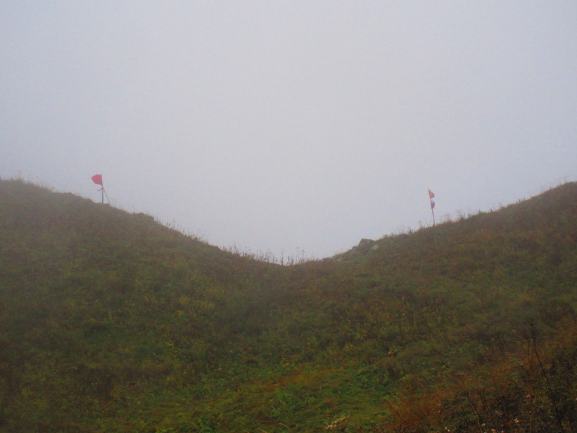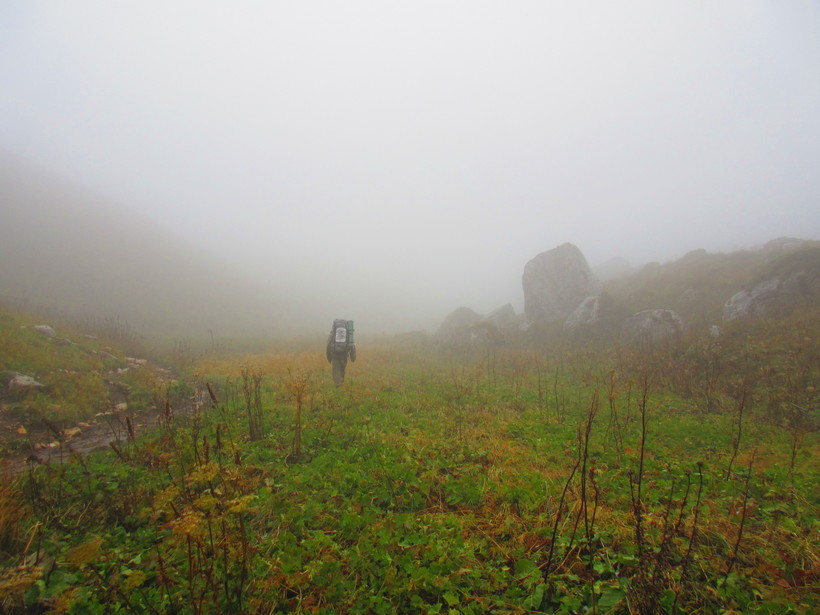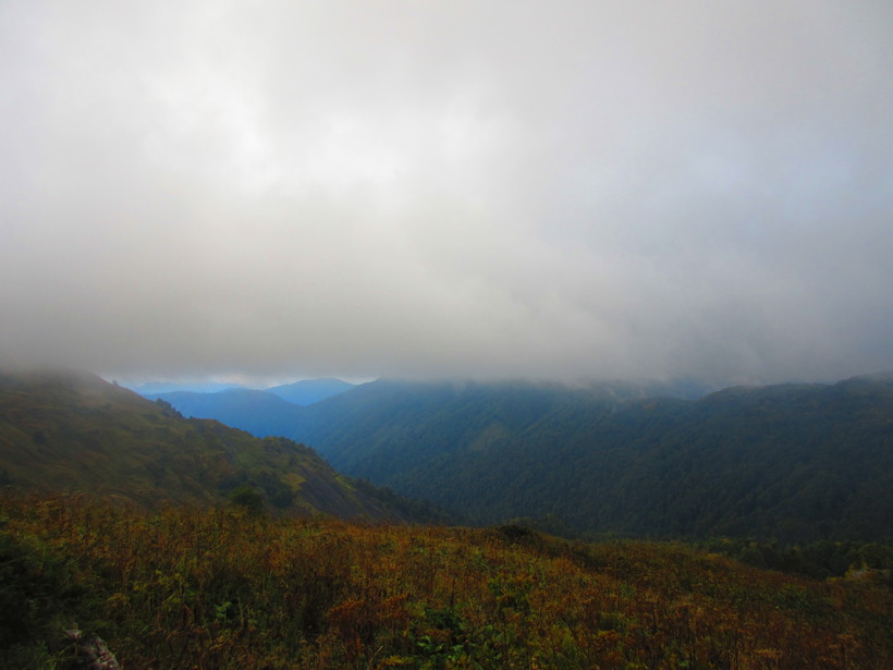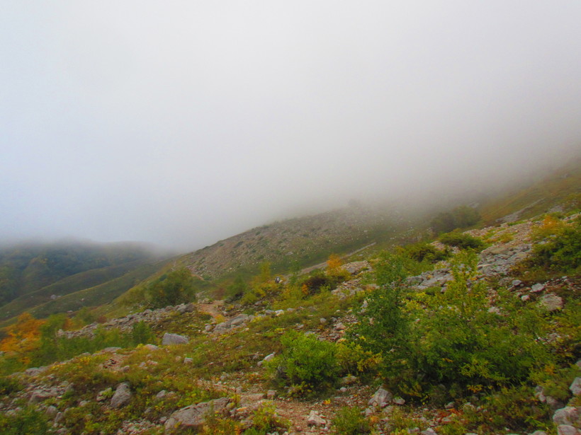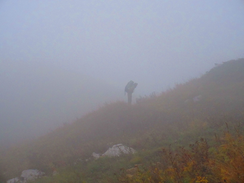 Первый перевал встретил нас сырым и холодным облаком, в котором видимость была почти на нуле.