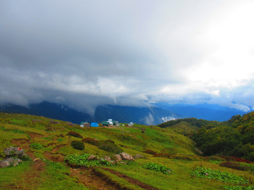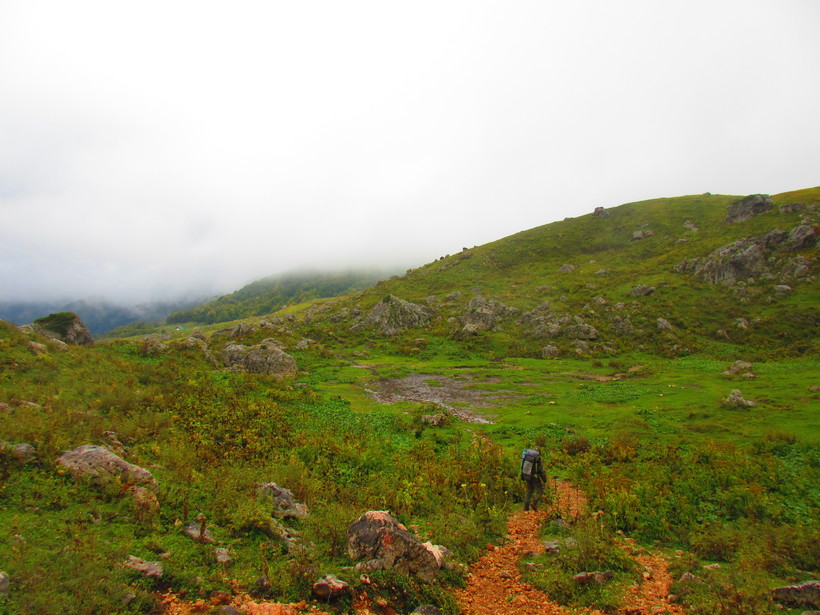 Спустя некоторое время ходьбы, лес закончился и стал приближаться первый перевал. Чем выше мы забирались, тем холоднее и пасмурнее становилось. По пути нам встречались группы людей возвращающихся после похода, увидев насколько грязными были их ботинки, я понял, что ошибся с выбором обуви. В этом я убедился, когда пошел дождь и превратил и без того мягкую почву в скользкую грязь, мои кроссовки не защитили мои ноги от промокания и мне пришлось с этим смириться на следующие четыре дня.