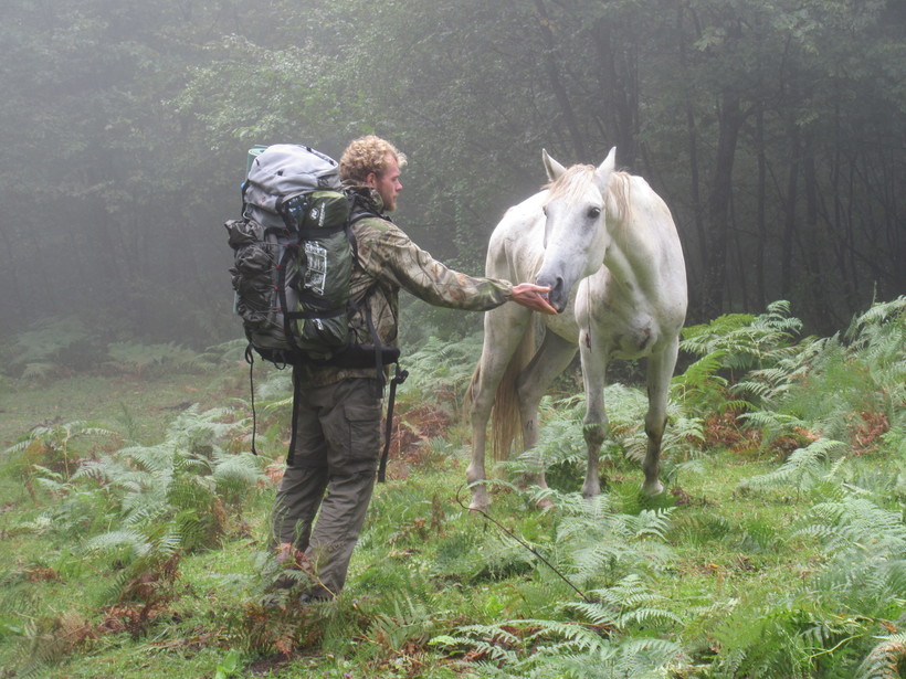 Через некоторое время начало темнеть и мы поставили палатку у ручья. Приготовили на костре ужин и неожиданно пошел дождь, в спешном порядке мы ретировались в палатку и в скором времени уснули под стук капель дождя о тент палатки. Проснувшись рано утром, я обнаружил, что видавшая виды палатка не справилась с объемами воды предоставленными дождем и большинство вещей промокли. Более того дождь и не собирался заканчиваться, пришлось сидеть внутри и ждать просветления. Дождавшись "перемирия небес", стали собираться в путь и обнаружили, что не одни. Наш гость (хотя может наоборот) с радостью принимал яблоки из рук моего друга.