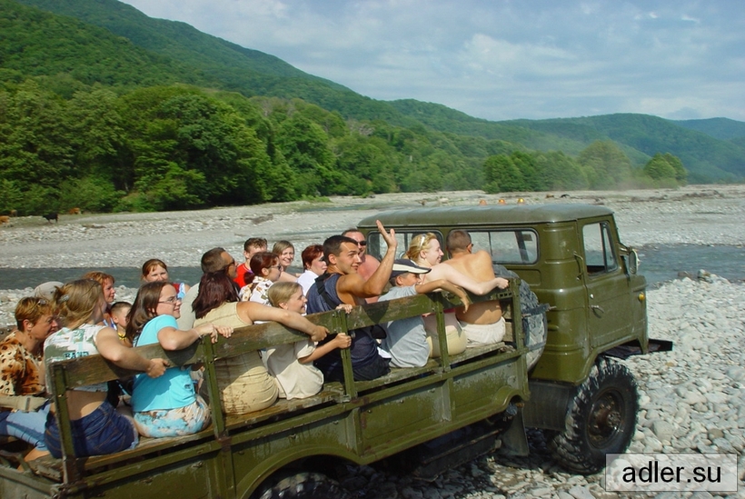 Экскурсию проводят обычно с изюминкой: катание на грузовике или на уазике по горной речке, с заносами и виражами. После утомительного серпантина на автобусе все в восторге. Потом уже все карабкаются по ступенькам вдоль водопадов. Стоит всё удовольствие где-то 1000 руб.