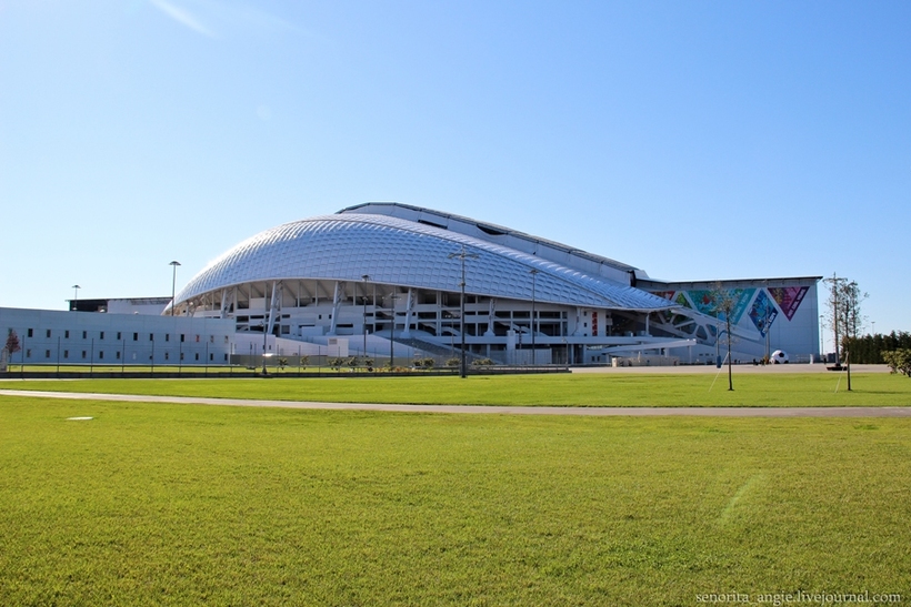 От самого Олимпийского парка в Сочи остались неоднозначные впечатления. С одной стороны, масштабы его и суперсовременные сооружения потрясают, особенно если вспоминаешь трансляцию олимпийских дней, когда всё здесь было подсвечено миллионами огней, вокруг были толпы болельщиков, пылал спортивный азарт… А сейчас тут как-то сонно и пустынно, хоть и много посетителей, и возят организованные экскурсии, но территория настолько огромная и голая, что кажется, что ты тут вообще один.