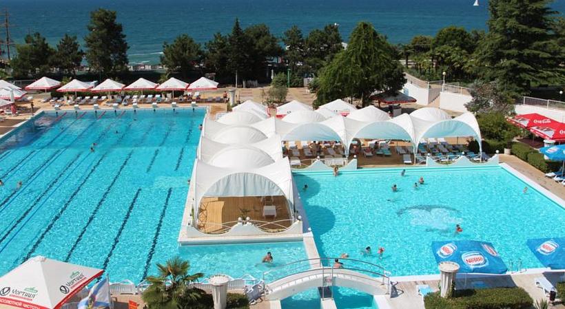 Бассейны в Сочи в основном находятся при санаториях и отелях, и они есть почти во всех крупных: в «Октябрьском», в «Светлане», в «Родине», в «Беларуси». Пользоваться ими можно не только проживающим, почти везде пропускают всех по разовому или даже месячному абонементу. Привычных нам, например, общественных бассейнов мы тут не встретили.