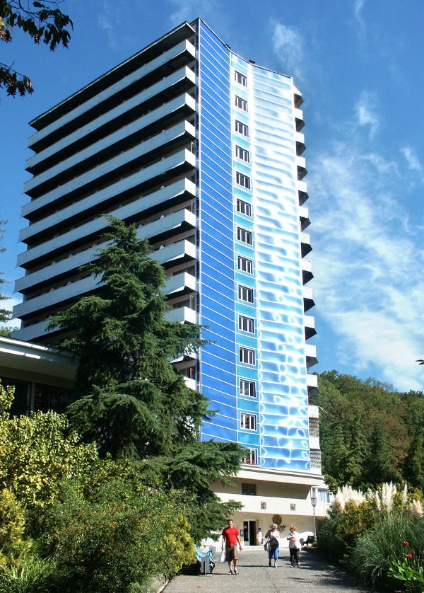 Мы там уже были и в целом остались довольны. Санаторий находится между центром и Хостой, тут многое в шаговой доступности – дендрарий, Летний театр, цирк. Здание, конечно, типа «советский профилакторий», но ремонт довольно свежий. До пляжа метров 100.