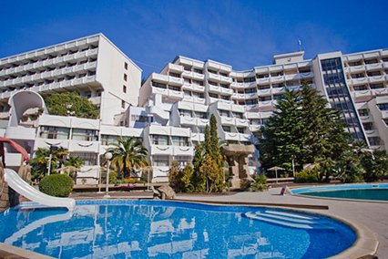 У него и расположение очень хорошее, подойдёт для любителей «выйти в люди», так как расположен очень близко к центру. Правда, до пляжа от корпусов идти далековато, метров 700 м. Тут всё для семейного отдыха: есть бассейн с горками, собственный пляж, детский центр.