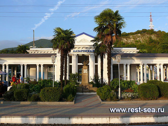 Поезд прибудет на станцию Лазаревское. Здание вокзала построено в античном стиле