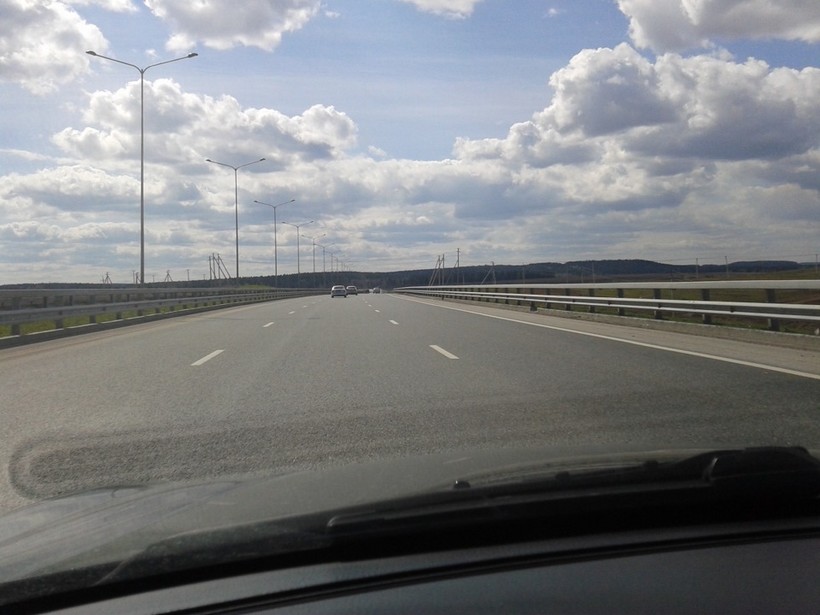 На подъезде к Перми начинается автомагистраль, шикарная дорога. Правда на этой магистрали мне откуда-то прилетел камень в лобовое и оставил скол, очень неприятно.