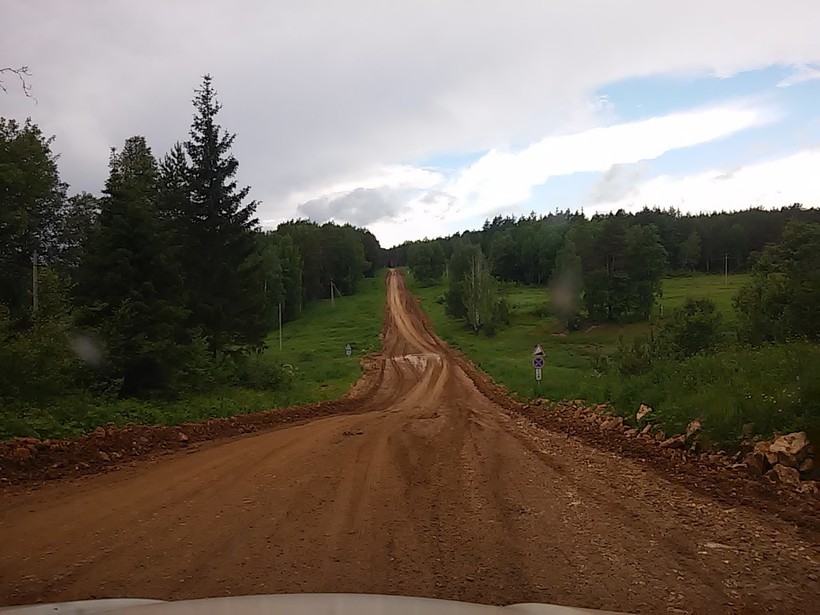 После Дружинино нужно свернуть налево. Сначала дорога очень хорошая, хоть и узкая, но транспорта мало. До Михайловска я доехал без проблем, а вот дальше было немного сложнее. В один прекрасный момент асфальт закончился и около сотни километров пришлось проехать по гравийке. Она хоть и качественная, укатанная, но все же ехать очень неудобно здесь. Только после поселка Лаклы дорога начала становиться лучше. Нормальная трасса началась только после того, как я проехал реку Юрюзань.