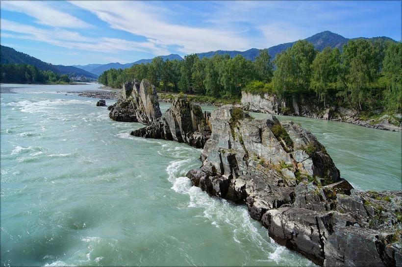 Вода в Катуни не прогревается никогда из-за бурного течения и ледникового происхождения реки. Хотя, среди нашей компании находились и такие, кто заплывал достаточно далеко на спокойных участках реки.