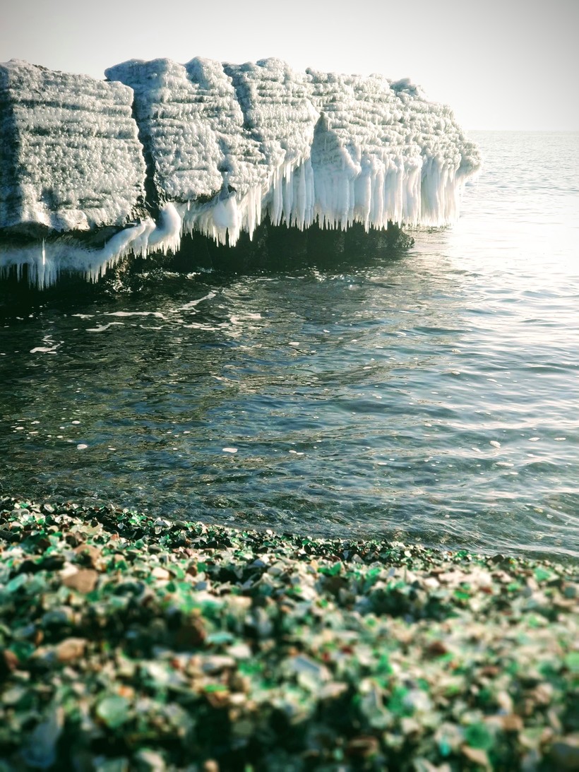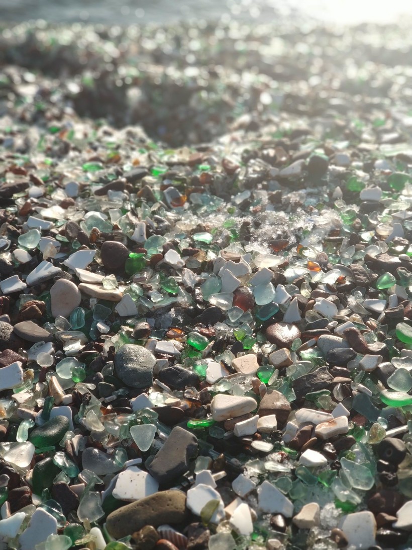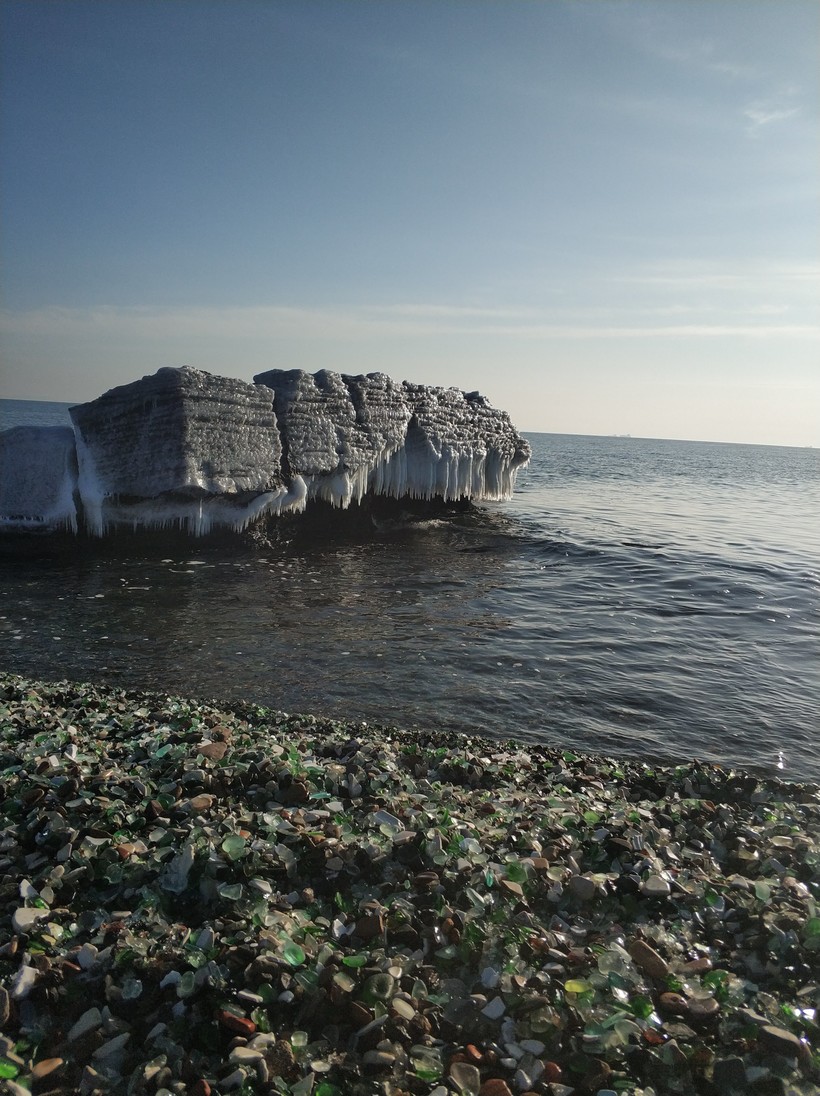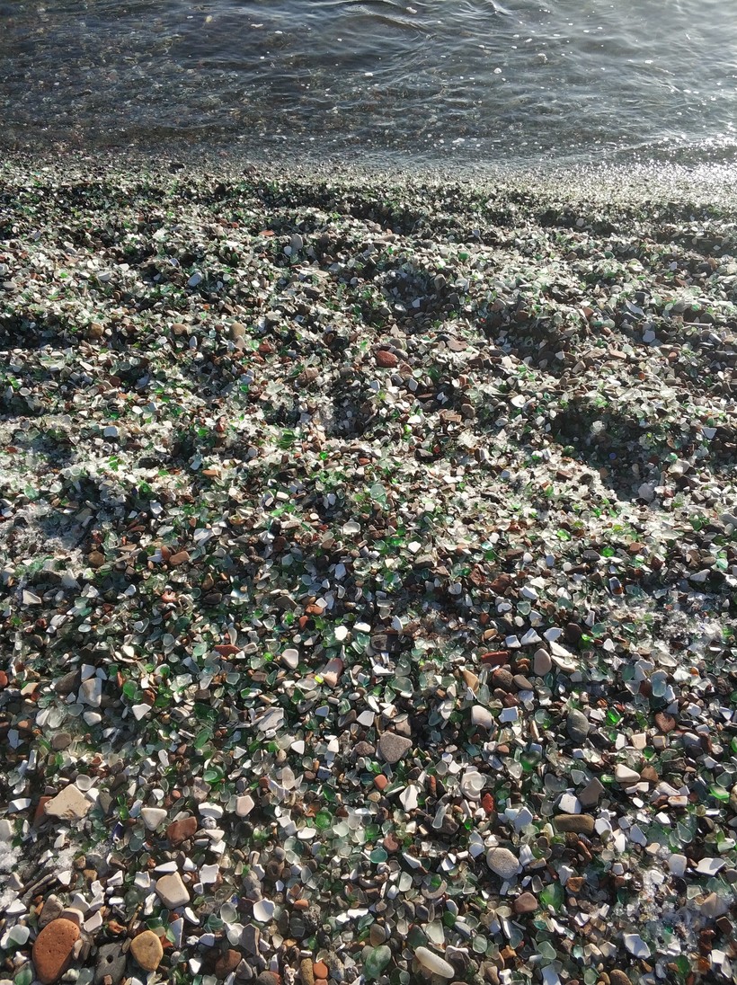 Но мало кто знает, что стекла тут появились не случайно, а из-за расположенной рядом "старой" помойки Горностай. И мусор с помойки сбрасывался в море... Из-за этого получилась пара маленьких бухт, усыпанные "отшлифованным" стеклом/керамикой... ну и много мелких проволочек/шестереночный и прочего мелкого мусора....