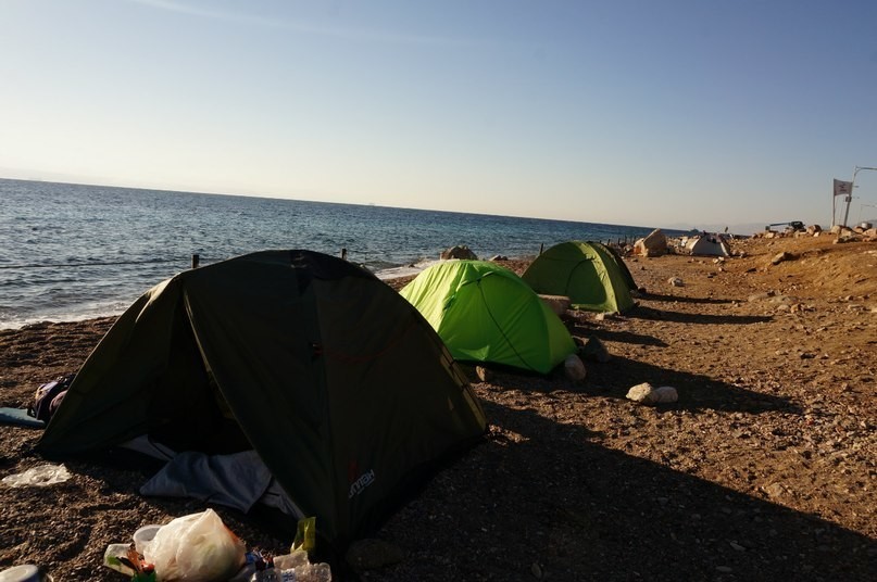 Ночевала я преимущественно в палатке – во-первых, Израиль отнюдь не дешевая страна, и это в полной мере относится к гостиницам, а хотелось сэкономить. Во-вторых, палатка, поставленная, скажем, на берегу Мертвого моря – это же так замечательно, тем более, погода для января была более чем приятной – нежная ночная прохлада сменялась ощутимым дневным теплом, но не было изнурительной жары. Надо заметить, Израиль вообще приспособлен для отдыха с палатками. На туристических картах отмечены кемпинги, а в любом супермаркете вы найдете все, что вам нужно для активного времяпрепровождения на природе. Например, баллоны газа для горелок, которые в путешествии вечно в дефиците – в самолете-то их не провезешь, а попробуй найти на местности!