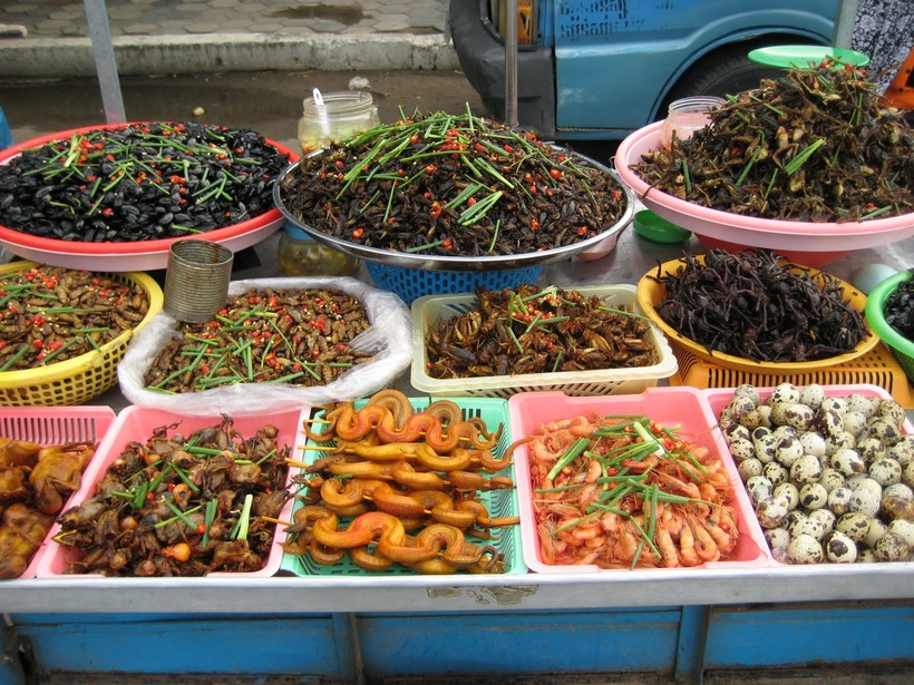 В отношении кухни могу сказать: на любителя. Ну, если вам нравится щелкать кузнечиков, пауков или лягушек вместо семечек, то понравится. Я вот, сначала не могла решиться, а потом, даже распробовала. Хотя Вадим так и не притронулся. Но не переживайте в камбоджийской кухне есть и вполне нормальные блюда: супы, рисовые макароны (понравились в кокосовом соусе), речная рыба, запеченная в шпинате, говядина, приготовленная в соусе чили. Поэтому голодными не останетесь. Из напитков в Камбодже предпочитают кокосовое молоко и рисовую водку (учтите, ее крепость около 50 градусов, по мозгам бьет конкретно!).