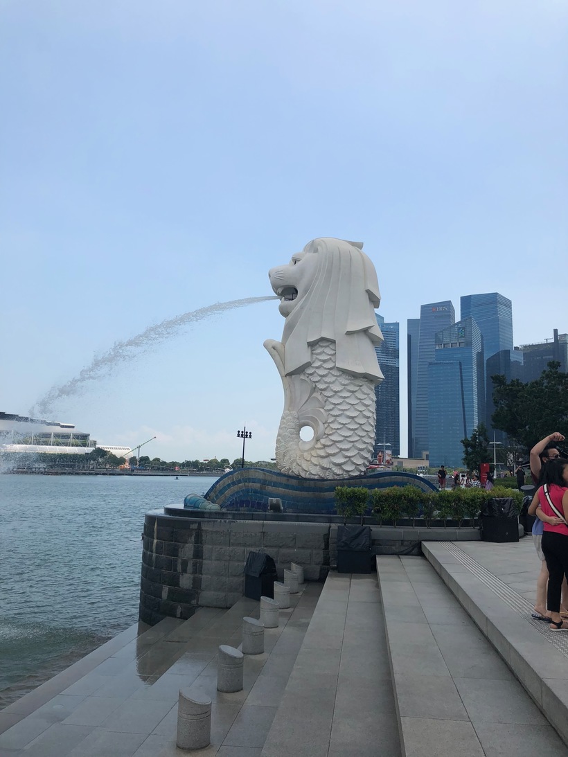 Обойдите залив и дойдите до статуи Мерлиона. Мерлион – это лев-рыба, то есть символ Сингапура. Вообще название Сингапур произошло в перевода с малайского лев+город, то есть как на Украине город Львов ;)