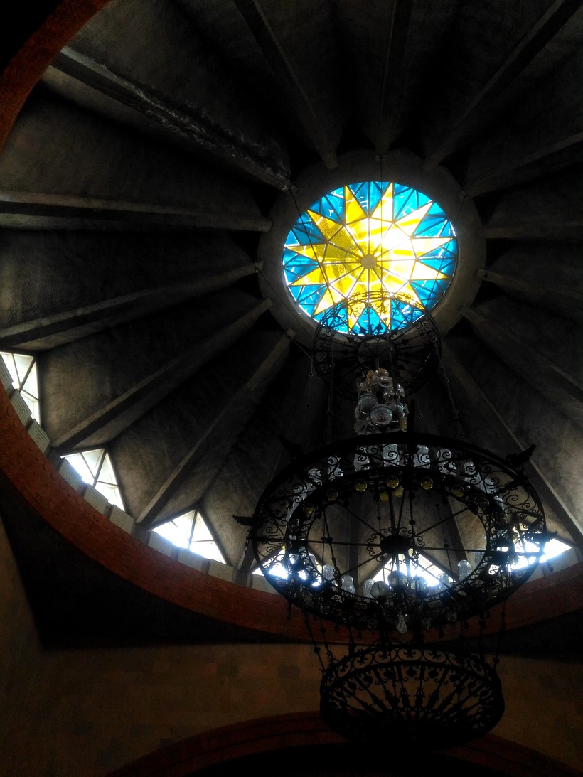 Удивил не то слово! Совсем издали здание показалось почти конструктивисткого толка, а подошли ближе и восприятие кардинально поменялось: вход украшен грандиозным панно в духе мифа о Гелиосе, купол низкий в традиционную гармошку положен, а на башенке уместились часы, где вместо цифр золотые фигурки, зодиака знаки. Зайти же внутрь — обомлеть можно: купол (в самом центре выложен витражом цветами желтка и лазури, где солнце на небе так, что лучи в сводах — бетона жестью рисунок зациклят. А под этим весомая кованная люстра в три ряда и дутого стекла лампы висят как воздушные шарики.