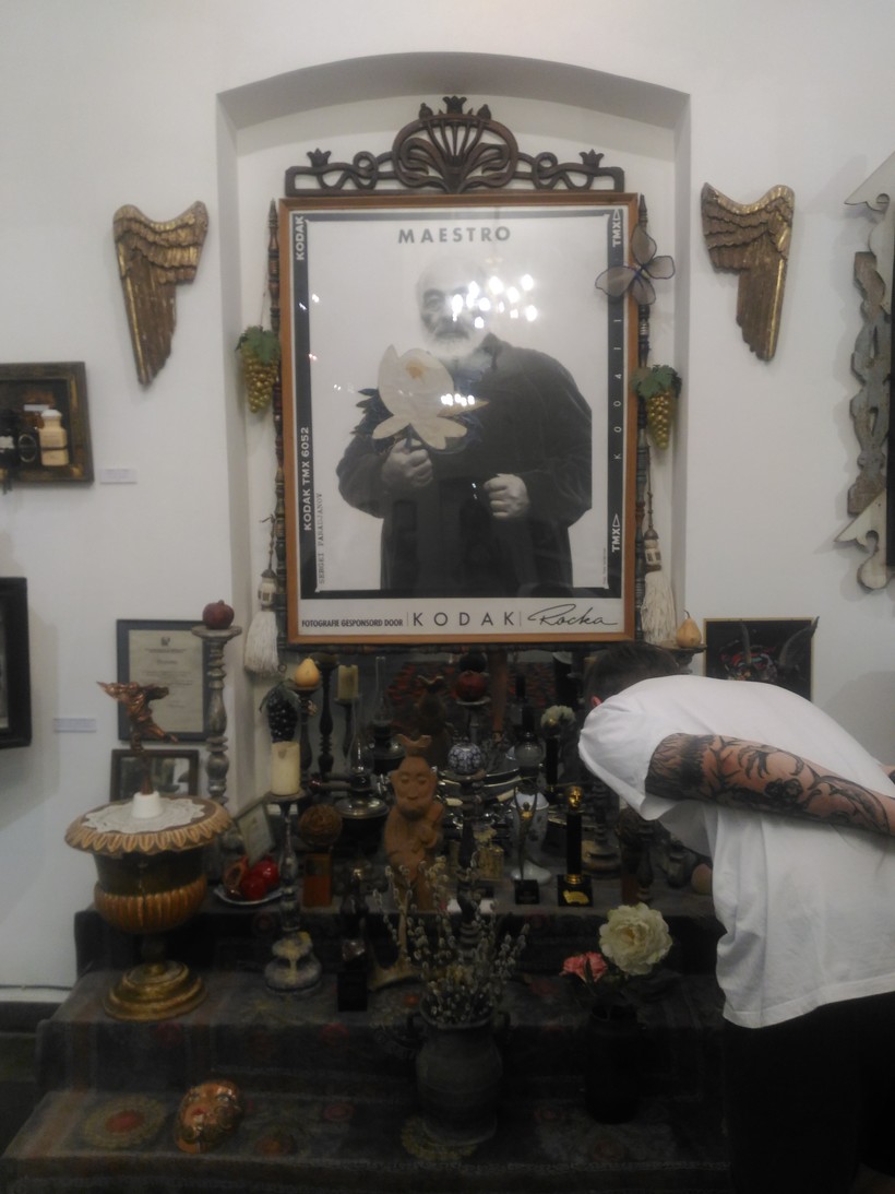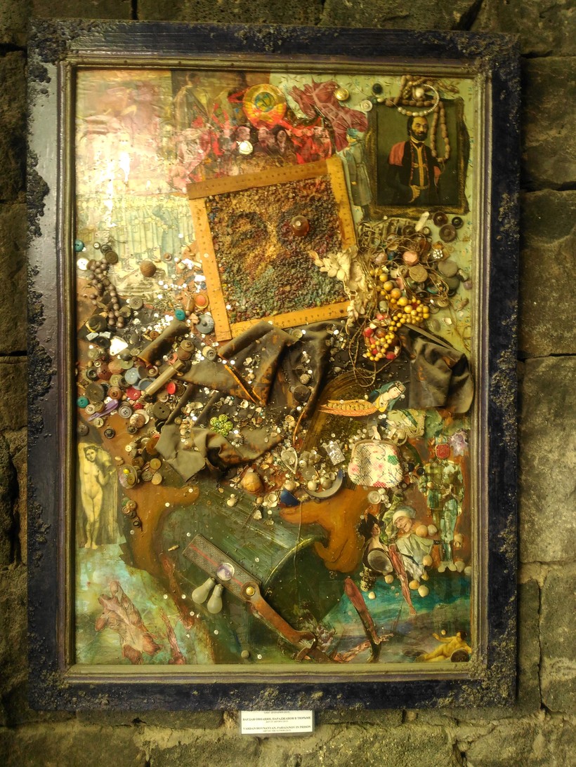Привлек нас тенью в свои сады, заманил обещанием прохлады внутрь. Сначала прошли вдоль дорожек где рассажены скульптуры, затем загляделись на туфа переборы, арки чернокрасные, и так шаг за шагом — мы незаметно оказались внутри главного здания, обозревая приметы старины. Макет старого города, живописи монохромные кусочки, мебель и убранство достоверно потрепанное предками, сценки быта (особенно понравилась убранная белым комната, где дева\невеста в окно смотрит, так что мы видим только ее платье да шляпочку), диковатые обереги, подвешенные к потолку и несколько приятных глазу мелочей