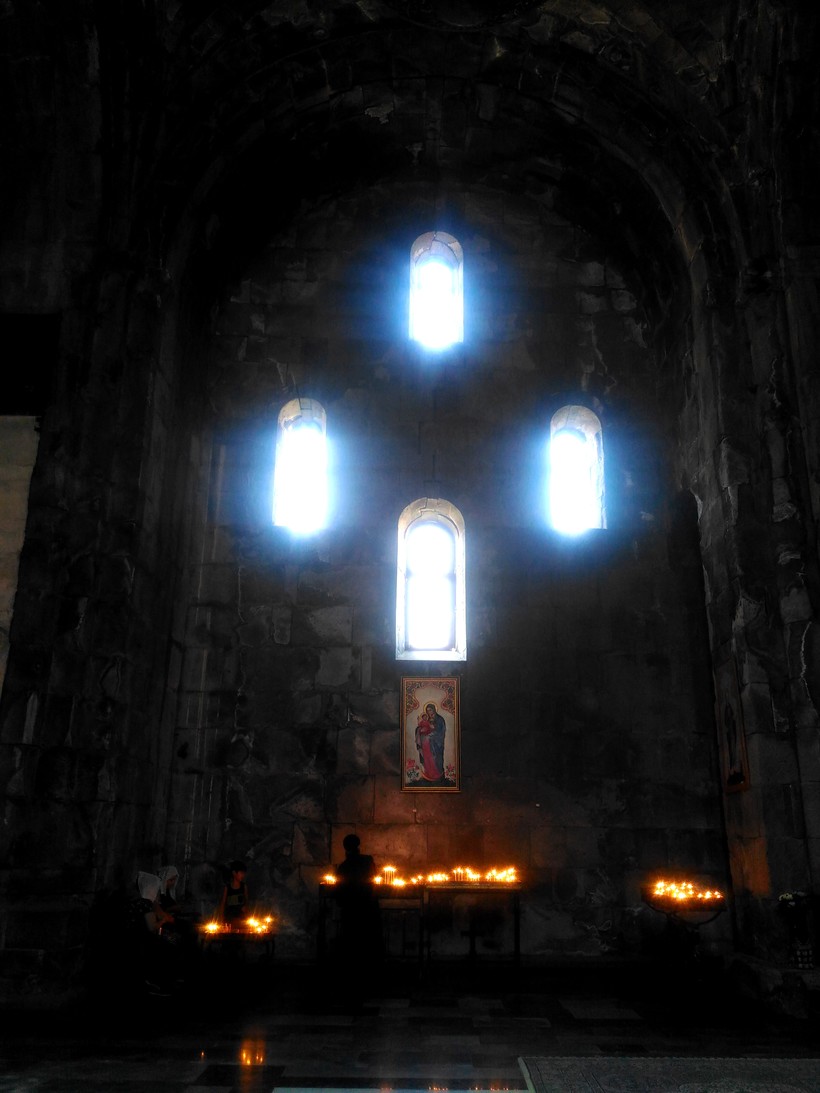 Далеко и дорого, но однозначно побывать там стоит. Дорога через горы камня, массивы плит, переливы зелени редкой, крутой замес простора игры света. Невозможно глаз оторвать, хочется запечатлеть, запомнить рьяно все эти красоты. Добраться к древнему монастырю и политическому центру горной Армении не так то просто, кроме длинного пути по серпантину, нас ожидал, и правда, почти полет по канатной дороге (самой длинной в мире — больше пяти км). Главная радость в том, что троссы протянуты почти по прямой, кабинка скользит неспешно и попутно рассказывает о достопримечательностях под ногами. Сам монастырь находится на стадии реконструкции, хотя большая часть уже собрана заботливыми руками буквально по кирпичику. Главная церковь очень темная внутри, свет попадает лишь через узкие прорези в окнах, что создает какой-то особый эффект почти экзистенциального переживания. С плато на котором стоит Татев открываются wow виды, красоты волнений, кое где весьма дико и растет ежевика, а кажущееся запустение соседствует с технологиями и типичным прикормом для туристов.