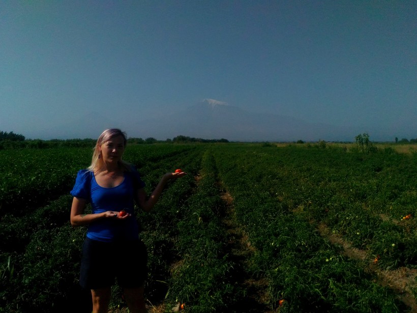 Кроме самого Татева у нас было несколько остановок, каждая из которых достойна отдельной строчки. Первая в поле помидоров, соседствующем с домашними виноградниками, поэтому нам не только удалось сделать забавные снимки на фоне Арарата, но и попробовать местных продуктов прямо с земли, а насекомым нас. Вторая на Винодельне, где случилась беглая экскурсия, а за ней дегустация проб здешних вин и купажей. Последняя внештатная остановка произошла у небольшого, но крайне вдохновляющего водопада, словно спрятавшегося в складках земной коры и окруженного дикой растительностью.