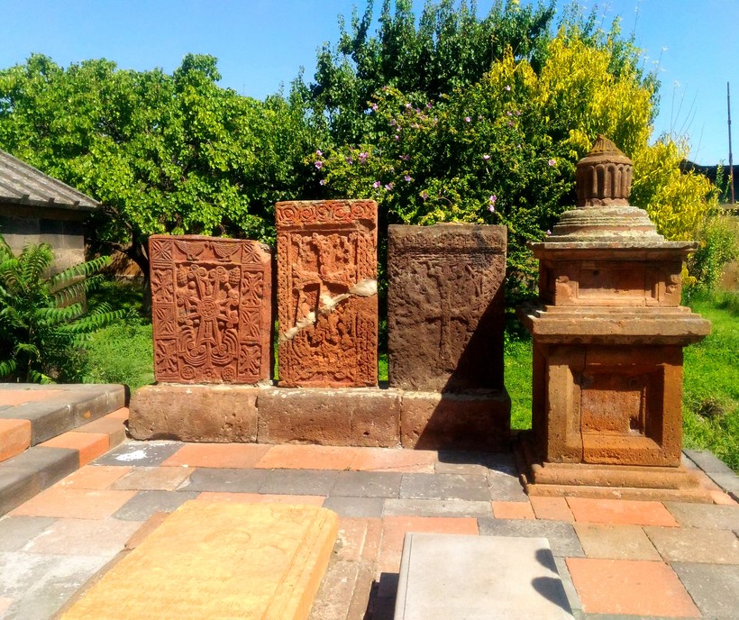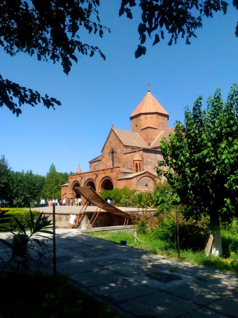 Привлек нас как древнейших культурный и религиозный центр, здесь расположен один из крупнейших монастырей в Армении — монастырь Эчмиадзин. Но выбор наш пал на это место, не из-за чрезмерной духовности (на обзор христианских реликвий мы тратить время и деньги не стали), а из-за архитектуры, ведь по сути место представляет из себя большой парк с культовыми постройками. Комплекс включает в себя несколько церквей, маленьких кладбищ с хачкарами, а также главный храм, музей и жилища для монахов. Среди изнуряющего зноя и толпы городского люда мы смогли обнаружить здесь волшебные островки свежести и уединения. Архитектура и правда оказалась на редкость разнообразной и даже не смотря на то, что главный храм оказался затянут паутиной реконструкции внутри и снаружи, мы прониклись явным духом прошлого.