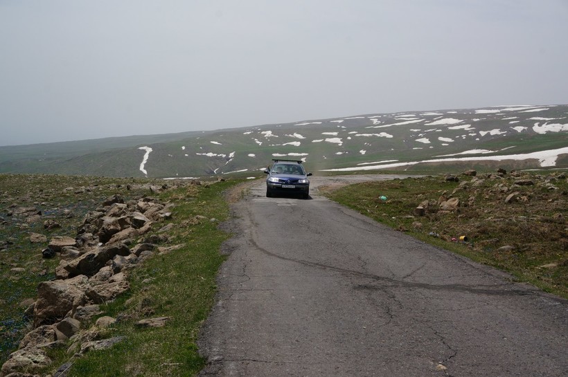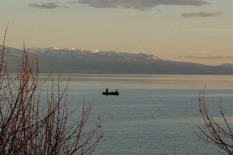 Здесь звенящая тишина, ни одной машины не проедет по верхней дороге. Солнце медленно садится в воду, озеро просто невероятно красиво. В сумерках на противоположном берегу появятся два светящихся пятна: огни небольших городов. Да рыбацкая моторная лодка пророкотала мимо на закате, вот и вся цивилизация. Мы, побродив по берегу, собираем побольше сухих сосновых сучьев и разводим костер, вокруг которого лежим на песке, закутавшись в спальники, пока не темнеет окончательно. С утра заканчиваем огибать по дороге озеро, остановившись в одном месте прямо посреди грунтовки, чтобы сварить кофе на газовой горелке. Армянское радио, играющее в машине, наполовину состоит из совершенно российской попсы, иные песни поются на двух языках. В целом в Армении хорошо говорит по-русски даже молодежь.