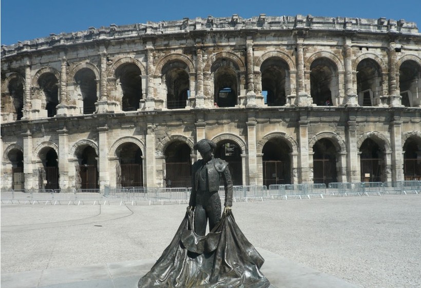 По-моему, визитной карточкой Нима можно считать древнеримский амфитеатр солидных размеров, эдакий "младший брат" Колизея, где в конце XX века проводились соревнования по корриде, и лучший из участников заслужил памятник.