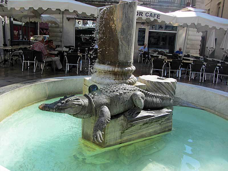 - А еще в центре города есть фонтан… с крокодилом! Не с живым, конечно, с каменным. Крокодил, прикованный к пальме, считается символом города, такое изображение встречалось на древнеримской монете. В память об этом прямо на рыночной площади построили такой необычный фонтан.