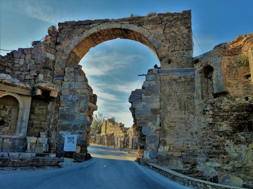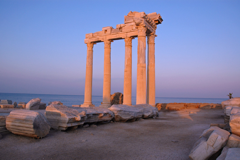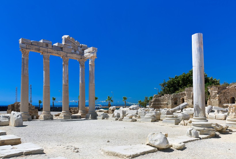 Пожалуй именно исторический центр является визитной карточкой Сиде, а именно знаменитый храм Аполлона, изображения которого можно видеть на магнитах и открытках в местных сувенирных лавках. Особливо красиво он смотрится на закате и рассвете со стороны моря. Для этого можно купить тур на яхте. Все развалины расположены в одном месте и начинаются с монументальной арки, через которую туристы и попадают на территорию города.