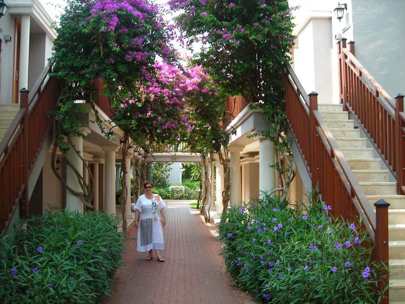 Но курорт поразил нас своей красотой. Очень зеленый, пальмы рассажены практически везде, куда бы не упал твой взор. Так как мы приехали летом, было очень жарко, особенно после полудня. Поэтому мы пораньше с утра, после завтрака, шли загорали, купались, а к полудню шли в свой номер, под кондиционер и отдыхали. На третий день, я обнаружила, что клей на моих пляжных тапочках начал плавится на солнце.