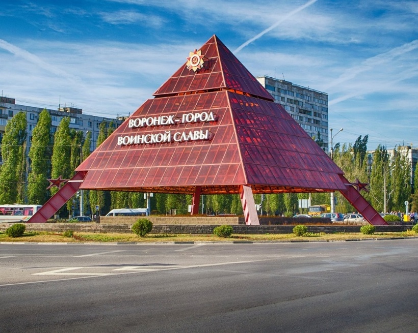 А еще в Воронеже есть весьма оригинальный памятник, посвященный Великой Отечественной войне. Как говорят сами воронежцы, построен он в стиле хай-тек, тем и уникален. Это гигантская красная пирамида, которая долгое время стояла без как-либо опознавательных знаков, а в 2009 году, после того, как Воронежу присвоили звание «Города воинской славы», на пирамиде появились соответствующие буквы. Этот памятник вызывает очень неоднозначные оценки, знакомые из Воронежа рассказывали, что поначалу, пока еще не стало ясно, что это такое, ходили самые разные слухи — вплоть до того, что его построили масоны. Но тем не менее, внимание он на себя обращает, особенно в темноте, когда подсвечивается изнутри красным.