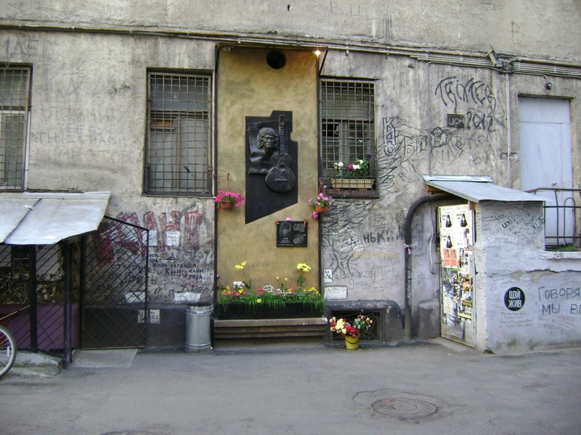 Так, во время прогулки от "Горьковской" мы с друзьями довольно неожиданно наткнулись на сквер Цоя. Буквально, заглянул за поворот - а там целая маленькая история: надписи чуть ли не со всех городов России, портреты Цоя, нарисованные прямо на стенах, строчки из любимых песен.. Минут на 30 мы просто "залипли", читая все это.