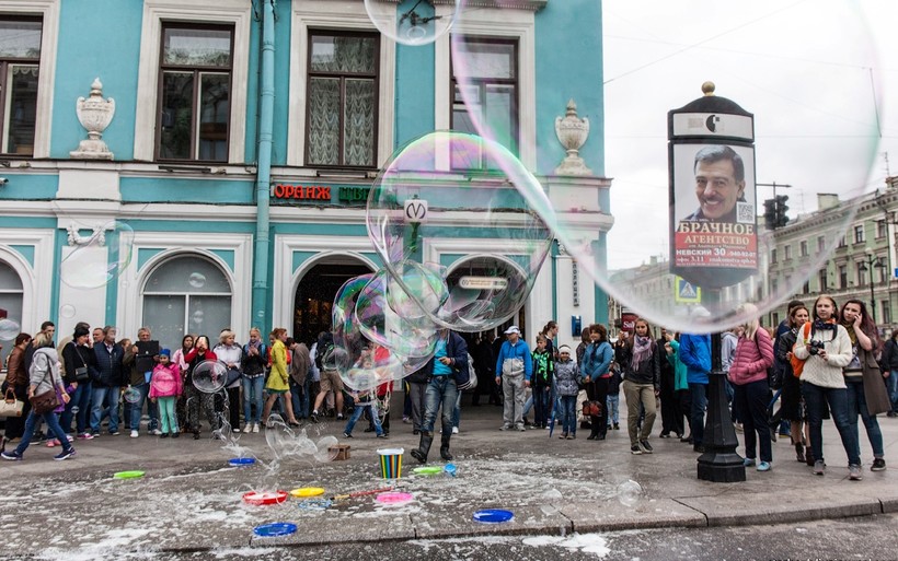 Но сердце творческого Питера – Невский проспект. Если выйти от метро и идти по улице направо, почти всегда встретите толпу народа. Там то шоу мыльных пузырей устроят, то пляски, то песни. Невский вечером – лучшее развлечение.