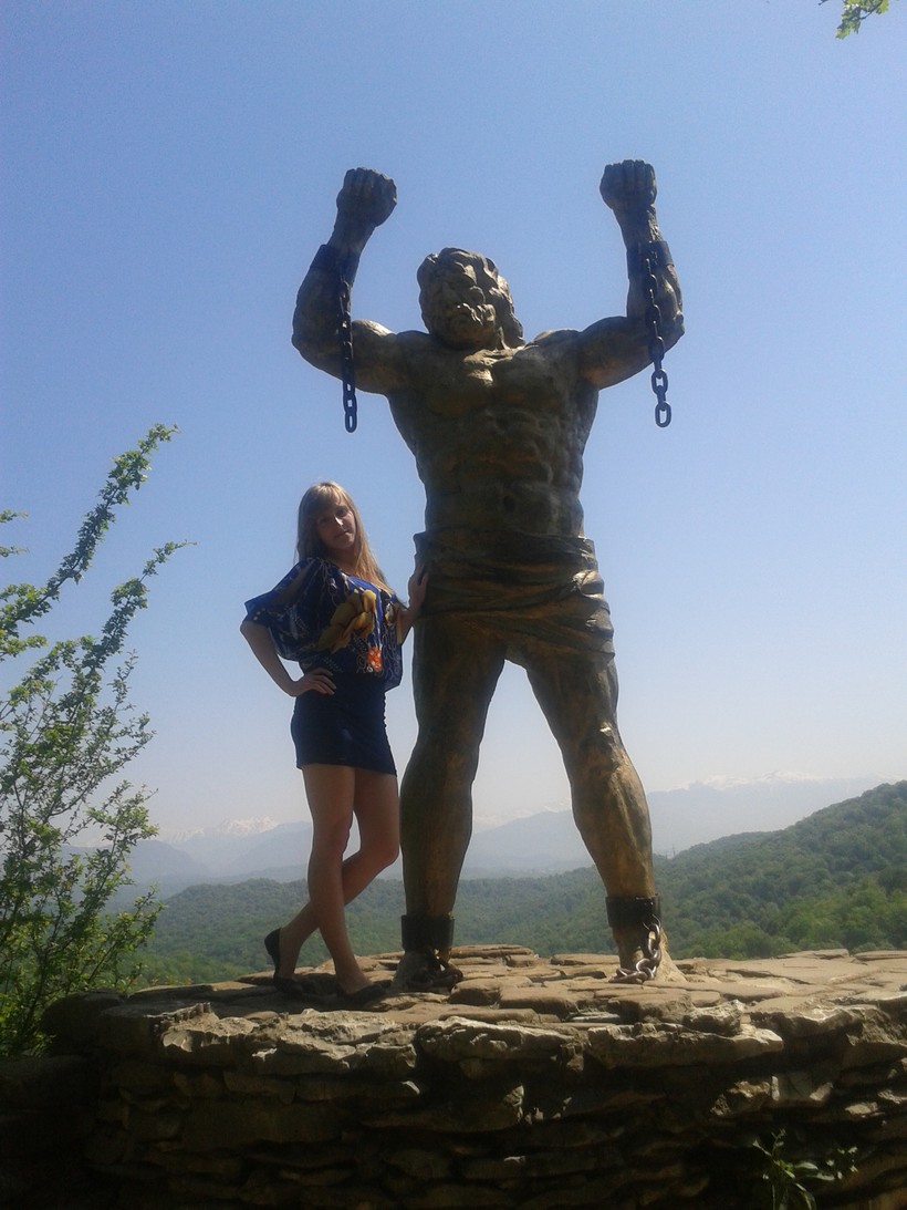 Доезжаете до санатория Мацеста, оставляете машину и идете пешком вверх по серпантину около 8 км. Слабо?! Мы дошли, потому что не знали, что, оказывается, нормальная дорога всё-таки шла до самого верха. А там – вид на водопад, горы Чугуш. Сидя в кафе на вершине и попивая горный чай, полюбуетесь на статую Прометея-прикованного и отдохнете от городской суеты.