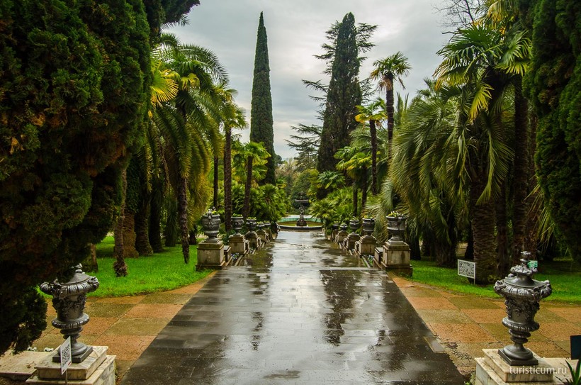 Во-вторых, не забываем про Сочинские парки. Один из самых известных, конечно, Дендрарий. Мы, к сожалению, оказались там в не очень хорошую погоду – в тот день лил дождь. Но и в дождевиках прогулка оставила приятные впечатления. Воздух там сладковатый, свежий, а виды просто великолепные. Обязательно обойдите весь парк пешком – наверх и вниз, и не поленитесь спуститься в нижний парк (там много животных!). Даже если Вы ничего не понимаете в растениях, Вас удивит их количество и скрупулёзность, с которой они посажены. Это стоит увидеть!