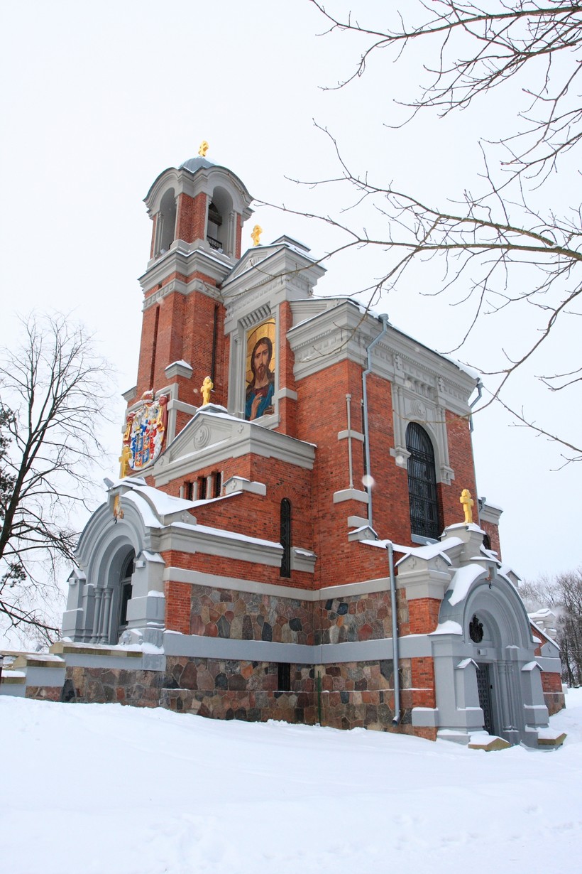 - Замковый парк. Это очень приятная зеленая зона с озерцом, а из объектов интересна часовня с ассиметричным фасадом. Это усыпальница князей Святополк-Мирских, владевших замком с конца XIX века до 1939 года, когда Мир вместе с западной частью нынешней Беларуси был отвоеван у Польши и вошел в состав СССР. Кстати, приставка -Мирские была у князей еще до приобретения этих земель.