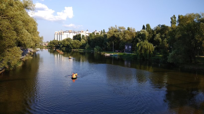 Сразу за Драматическим театром можно попасть в Парк Победы, по которому сами мы не очень много гуляли, так как в свою очередь этот парк плавно переходит в набережную реки Везёлки, где наслаждаться спокойствием этого города можно вечно. В один день мы сидели на деревянных настилах (можно и на пуфиках) с одной стороны реки, а на противоположном берегу на большом экране нам показывали художественный фильм отечественного производства (кстати такие летние кинопросмотры обещали показывать каждую субботу). На следующий день, вернувшись на набережную в жаркий будний день, мы развлекли себя иным досугом, а именно катались на лодочке и кормили уточек.