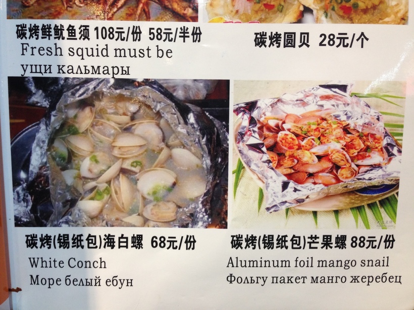 Чтобы как-то выйти из ситуации, мы ходили в кафе, нередко брали просто уличную еду, которая очень популярна в Китае. Меню во всех кафе на русском языке, поэтому делать заказ легко и просто. Чаще всего мы заказывали морепродукты и легкие супчики.