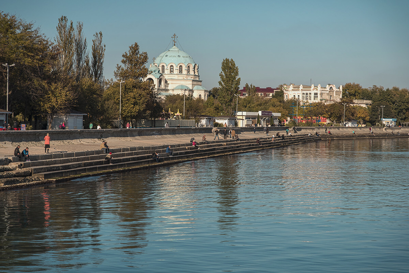 Во-вторых, море и пляжи. (В общем-то, из-за этого мы с вами и едем на юга). В Евпатории имеются песчаные пляжи, что очень важно для отдыхающих с детьми. Я же облюбовала для купания и «принятия солнечных ванн» набережную Валентины Терешковой. И хоть там ничего для этих целей не оборудовано (нет кабинок для переодевания и пр.), все равно масса туристов любят именно это место. Море сразу глубокое у спуска с гранитных плит (ясно дело, это место не подойдет для купания с детьми), а когда ты плаваешь, то сразу с берега открывается удивительная панорама. Вы видите на фоне синего неба и зеленых парков и Николаевский собор, и минареты мечети Джума-Джами. Подсказала мне это место моя знакомая, которая, живя в Москве, купила в центре Евпатории маленький домик и каждое лето сюда приезжает. То есть при прогулке и осмотре достопримов центра (Старого города) можно прихватить с собой полотенце и тут же окунуться в прохладные черноморские волны.