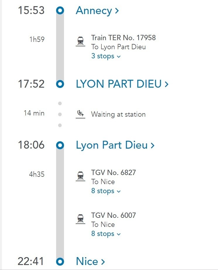 Добраться в Ниццу по железной дороге можно, например с пересадкой в Лионе. Вот один из наиболее удобных вариантов.