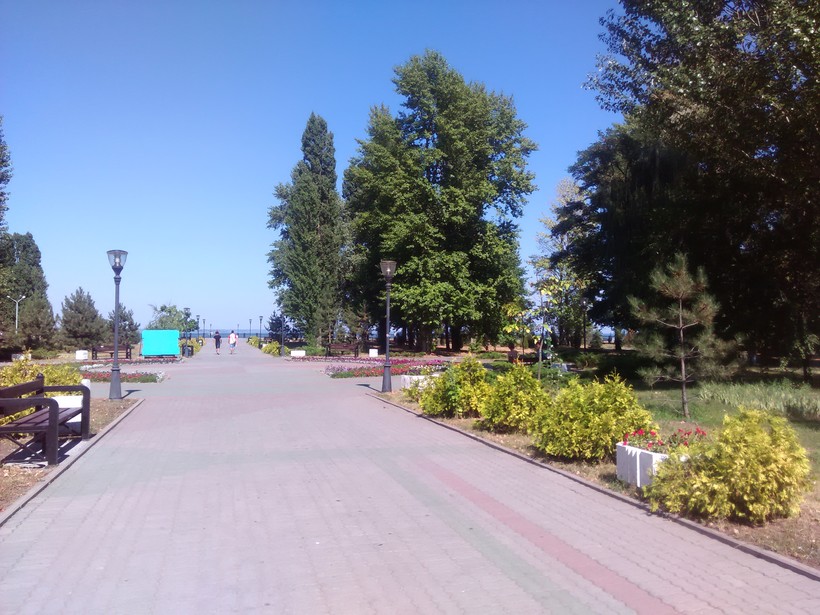 Ну и, конечно, Азовское море. Его побережье здесь разное – есть пляжи, есть ресторанчики у кромки воды, есть новые порты и старые рыбацкие поселки. Смотрится красиво, вот только купаться здесь - это особый процесс. Мало того, что оно очень мелкое, и взрослому человеку не удаётся нормально погрузиться в воду ниже пояса, так еще и дно илистое. В принципе, есть каменистый пляж. Зато прогревается отлично. Вот только я была в августе, когда вода начала цвести и имела крайне необычный изумрудный цвет. Местные говорят, что сами ездят поплавать на окрестные реки и озёра.