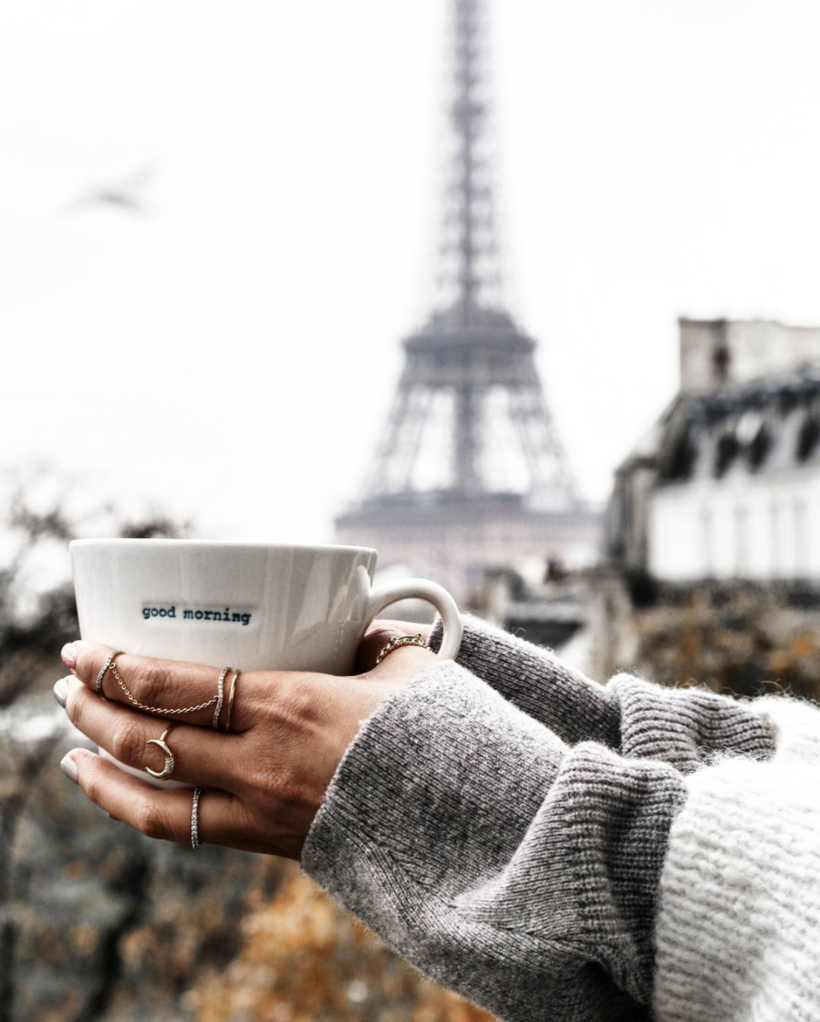 •любование Эйфелевой башенкой, сидя на дорожном бордюре со стаканчиком кофе в руке.