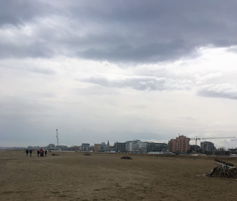 В феврале вся береговая линия напоминает город призраков. В песке находятся водные аттракционы, ждущие своего звездного летнего выхода, тут и там покачиваются от ветра дверки кабинок для переодеваний и огромные, но пустые стоят гостиницы на первой линии у моря в процессе ремонта и подготовки к сезону. Погулять и помочить руки в водичке Адриатического моря – обязательный пункт программы даже зимой. После чего сразу же бежим в историческую часть города. Она вполне себе хороша.