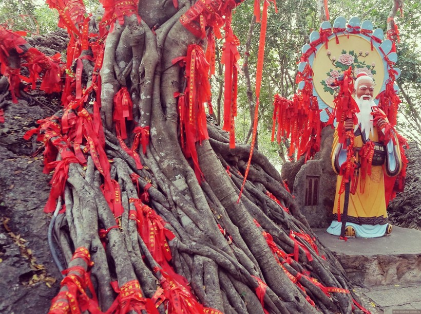 - Дерево, которое с макушки до корней увешано красными ленточками. Очень необычно смотрится. По местной легенде, если повязать ленточку и загадать желание, оно сбудется. Ленточка покупается прямо там, стоит недорого.