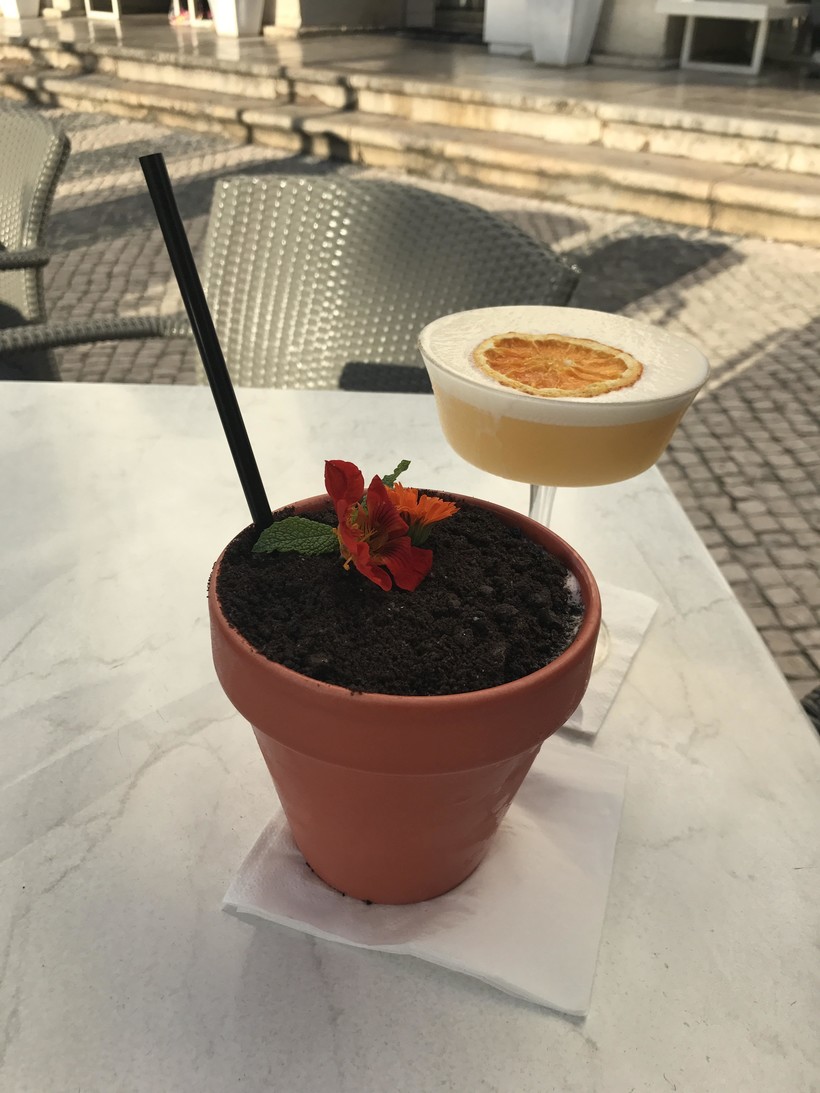 Эта подача сводит с ума. Я бы в жизни не догадалась, что передо мной чернично-йогуртовый коктейль(без алкогольный), а не горшок с землёй! Сверху всё посыпано шоколадной крошкой и украшено цветочком.