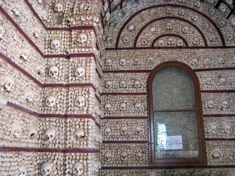 Ее главная особенность состоит в том, что стены буквально возведены из костей, в них вмурованы черепа 1200 монахов-кармелитов. Церковь старая. В дневное время особенно ярко переливается на солнце.