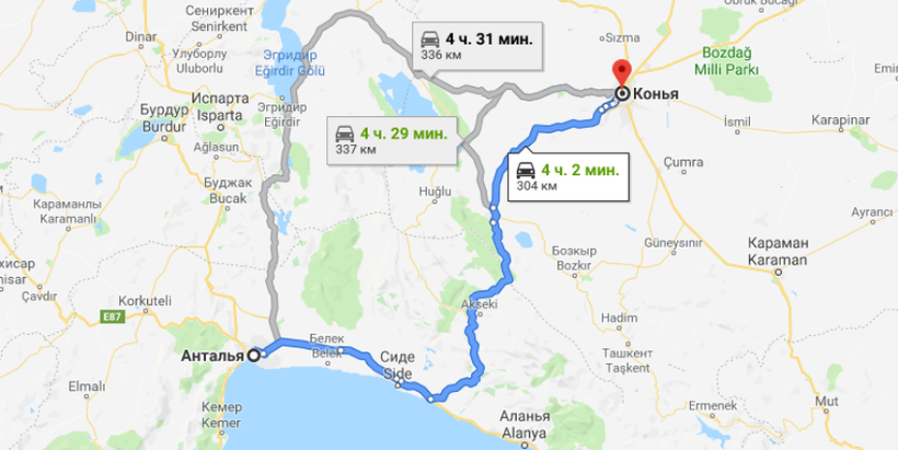 Анталию и Конью разделяют 300 км, проехать такое расстояние получится примерно за 4,5 часа.