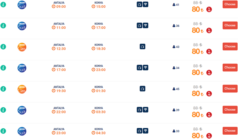 Ниже приведена информация о том, сколько часов вам потребуется, чтобы добраться от Анталии до Коньи, а также приведена примерная стоимость проезда (средняя цена билета) на том или ином виде транспорта.