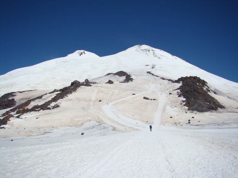 Самой высокой точкой, на которую можно подняться на канатке - Гара-Баши, это почти 3800 м. Отсюда открывается великолепный панорамный вид на Кавказский хребет и на его главную вершину – двуглавый Эльбрус. Кажется, что вершина совсем рядом. Но до нее топать и топать. При желании можно подняться на ратраке или пешком прогуляться по леднику до Приюта 11 (4050 м). Выше без акклиматизации идти не рекомендую.