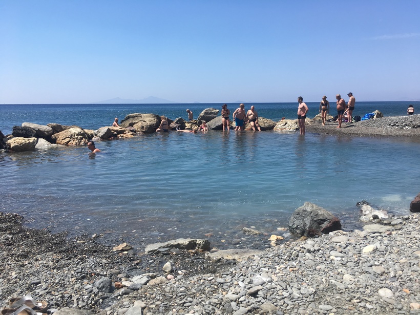 Термальные источники – вот уж куда непременно стоит поехать. Дорога вела нас по крутому серпантину, из окон машины мы любовались морским пейзажем и отвесными скалами. И вот мы и прибыли. Машину оставили на специальной парковке. Дальше путь мы продолжили «на своих двоих» и потопали вниз по протоптанной тропике среди скал. Запах тухлых яиц известил нас, что мы пришли туда куда надо. Сероводород. Именно так он пахнет. Сами источники находятся на побережье и плавно переходят в море, огорожены большими каменными глыбами, чтобы целебная горячая вода не так сильно смешивалась с холодной морской. В предвкушении принятия теплой ванны я была шокирована, когда моя нога ступила в кипяток и стала ярко-красного цвета. В самой ванне никто не купался за исключением одного смельчака бордового цвета, который нежился в этой «ароматной» водице. Все остальные туристы лежали в воде по другую сторону камней, там, где вода смешивалась с морем и была теплой. Я сначала последовала их примеру, но толкаться в тесноте не по мне, и я рискнула после холодного моря окунуться в кипяток. И это было круто! Главное плыть быстрее на другой берег ванны, а потом снова в холодное море! В это райское место мы приехали еще один раз, когда море штормило, и вода в ванной смешивалась с морской и была комфортной температуры, но теперь в ней стояли многочисленные туристы и того кайфа я уже не почувствовала.