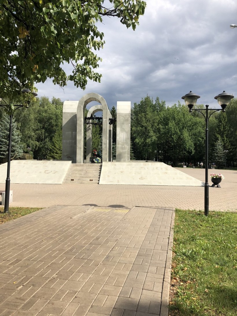 Мраморный монумент создан не так давно, даже в тёплый сезон, он как будто ледяной, сверху кованные розы с шипами, ощущения непередаваемые. По середине небольшой постамент, куда складывают цветы, в основном живые. Пройдя немного дальше по аллее, можно встретить и несколько экспонатов боевых машин, естественно, дети уже всё облазили.