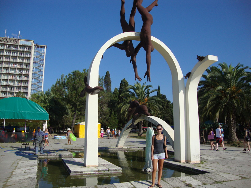 Заключительным объектом променада стала набережная, наиболее оживленный район курорта, знаменитая своей композицией «Ныряльщики за жемчугом». Она привлекает туристов, жаждущих запечатлеть себя на ее фоне. Мы выбрали для фотографии панораму кавказских гор! :)