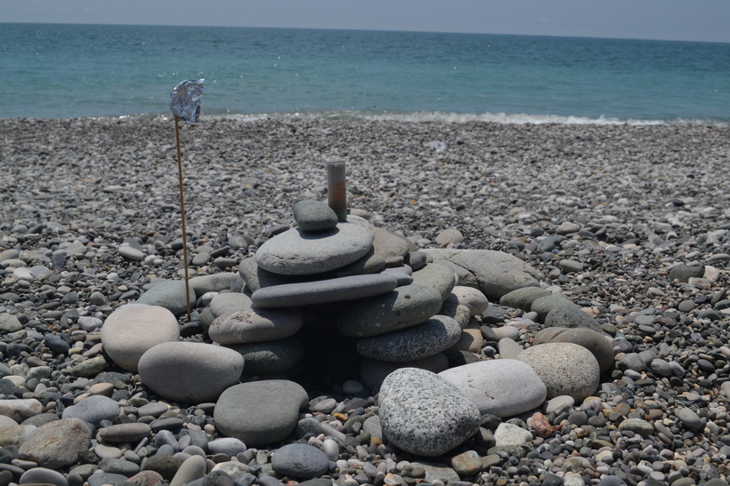 Началась наша прогулка с автобусной остановки, следуя от которой вдоль многочисленных жилых домов, мы оказались на берегу моря. Пляж просторный, широкий, немноголюдный. Данный факт нас чрезвычайно порадовал. Галька под ногами послужила отличным массажером для стоп, а дочке строительным материалом для замков.