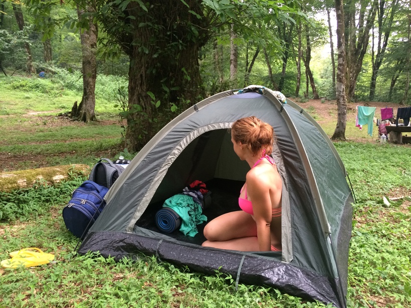 На Шлыпре отдыхаем много семей с маленькими детьми. Они ставят большие лагери с удобствами и остаются на несколько месяцев. Место полностью отгорожено скалами от цивилизации. Можно целыми днями наслаждаться природой и морем. Обычно все приезжают на долгий срок. Насколько я помню, стоимость палатки 200 рублей в день. Но берегу есть душ с пресной водой. Туалет с удобствами на природе, имейте ввиду. Через палаточный городок проходит речка, которая становится в не сезон полноводной. А летом – это небольшой ручей. Вдоль реки можно пройти в глубь леса. Там очень красиво и напоминает джунгли.
